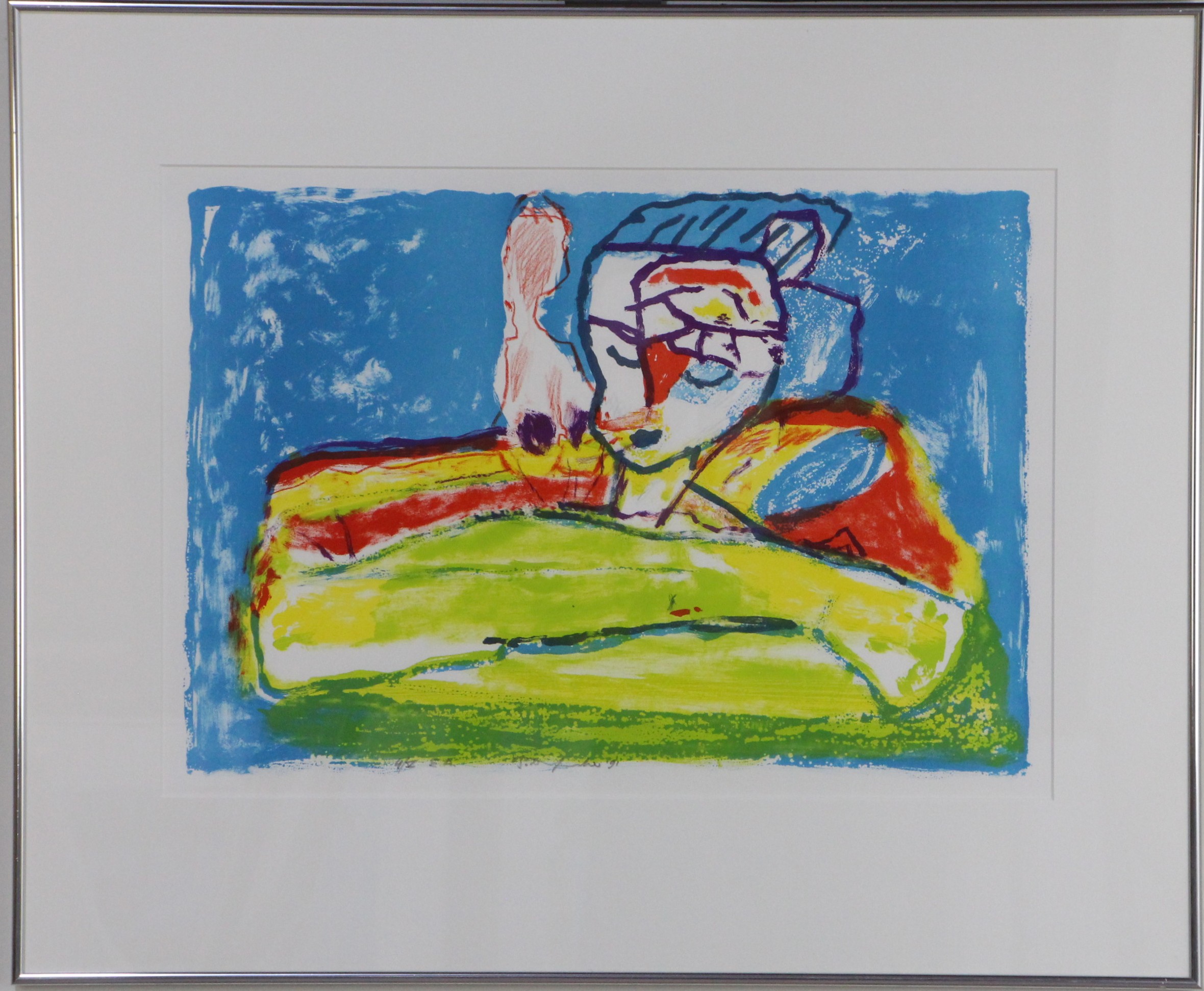 Zeefdruk op papier, oplage 4/5 E.A. . Gesigneerd aan voorzijde. In zilveren aluminium lijst (71 x 86) met glas.