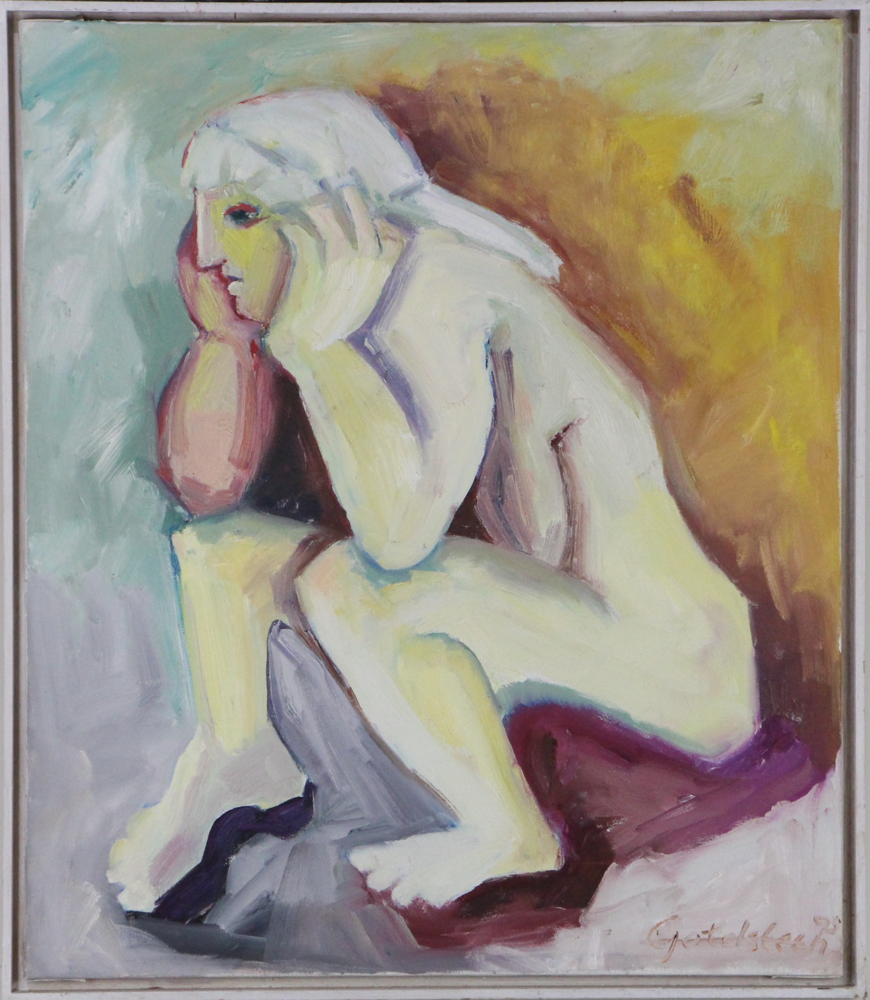 Olieverf op doek, uniek werk. Gesigneerd aan voorzijde, in witte baklijst (74 x 64). Afmetingen werk: 70 x 60