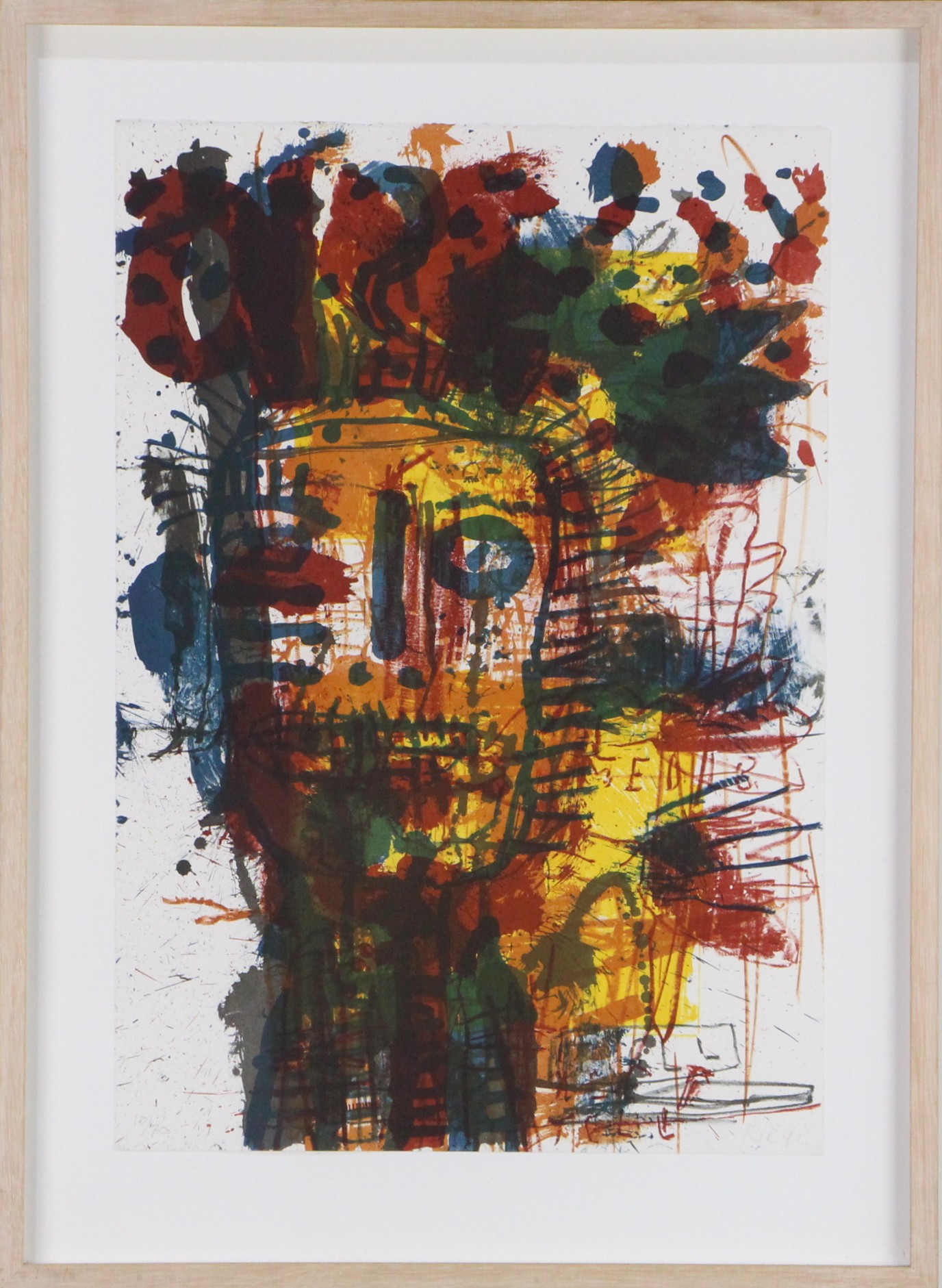 Zeefdruk op papier, oplage 10/70. Gesigneerd aan voorzijde, in houten lijst met glas.
