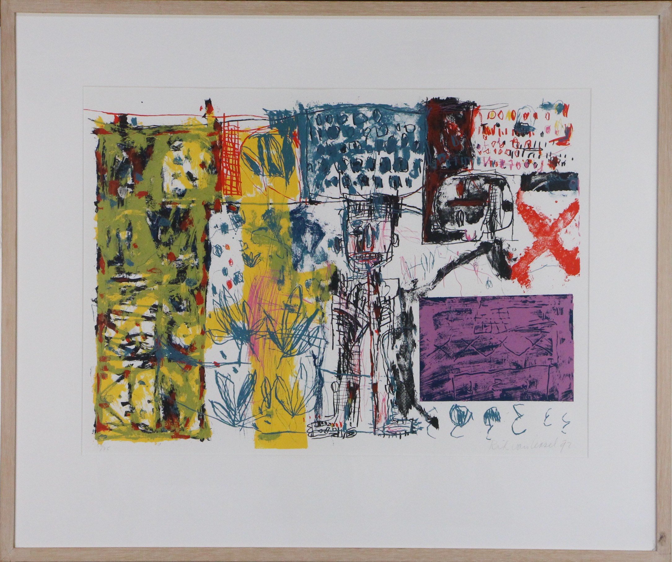 Zeefdruk op papier, oplage 56/75. Gesigneerd aan voorzijde, in houten lijst met glas.