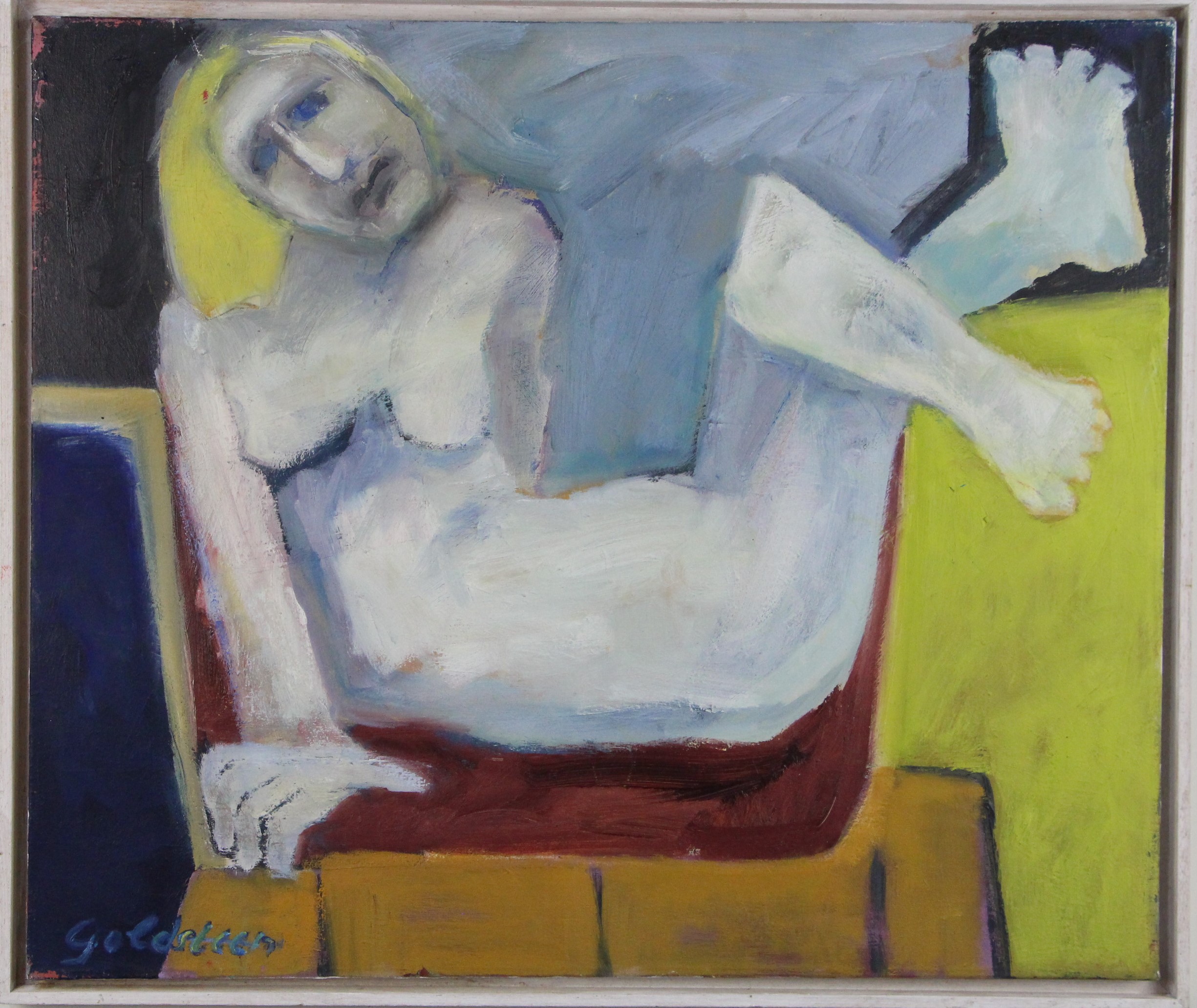 Olie/acryl op doek, uniek werk. Gesigneerd aan voorzijde, in witte houten baklijst (57 x 68). Afmetingen werk 55 x 65
