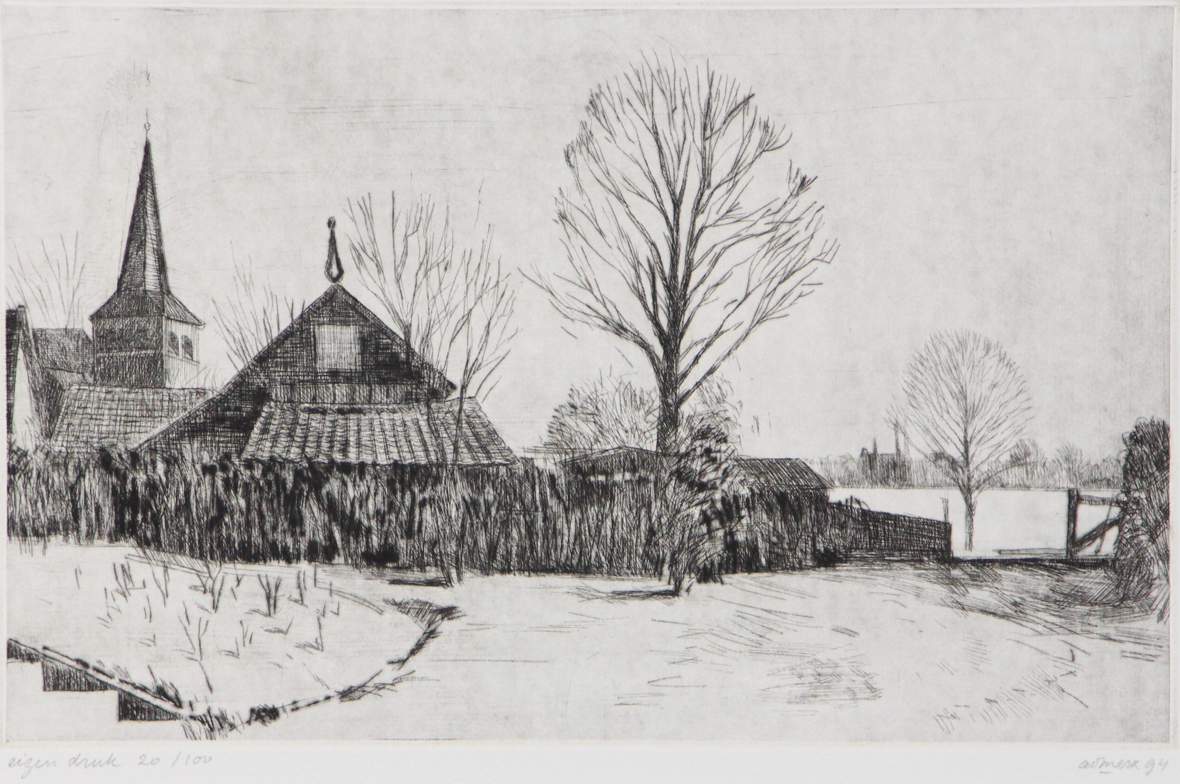 Ets op papier, oplage eigen druk 20/100. Gesigneerd aan voorzijde, zonder lijst. Afmetingen 20 x 30