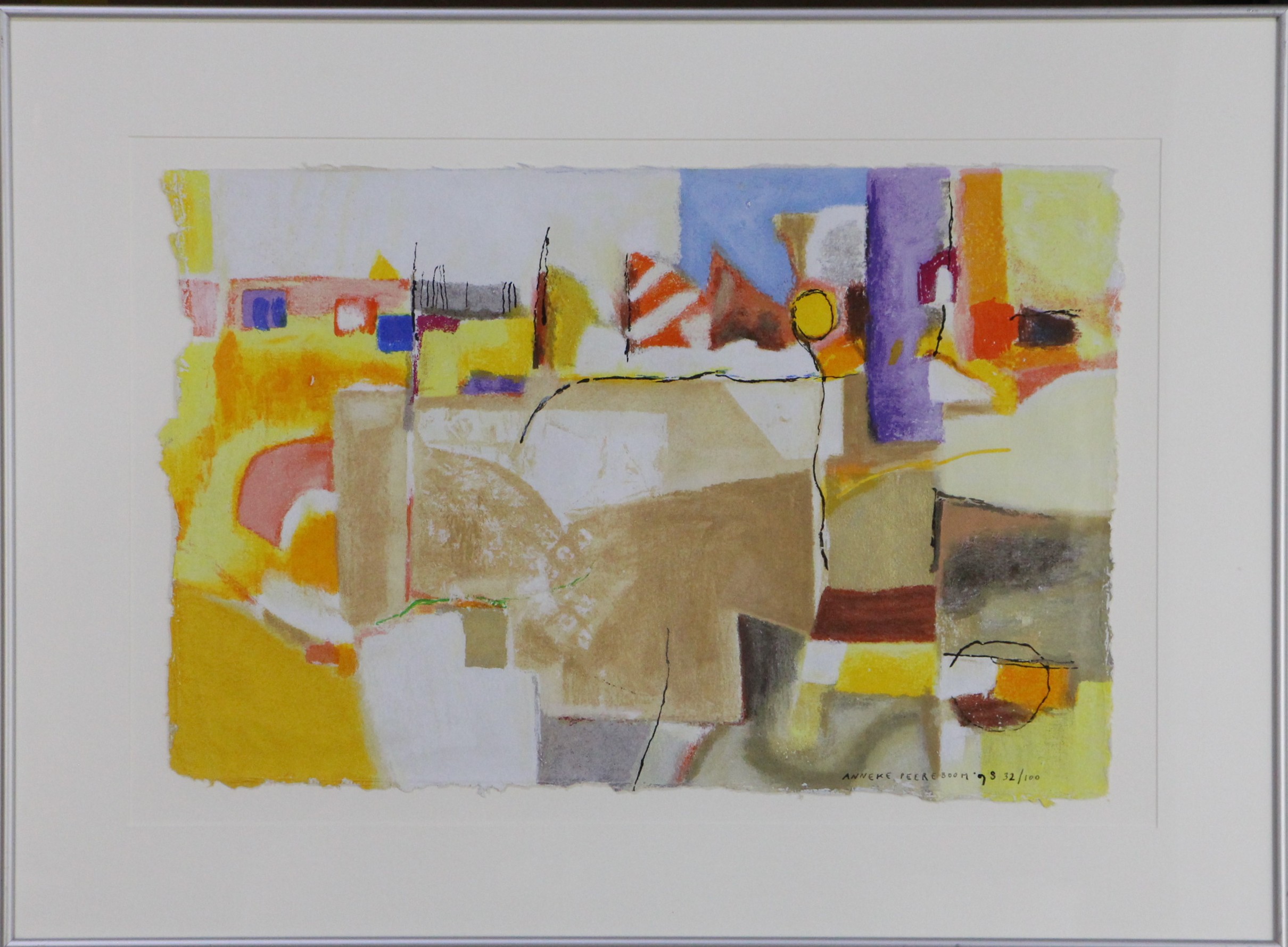 Zeefdruk op papier, oplage 32/100. Gesigneerd aan voorzijde, in aluminium lijst met glas.