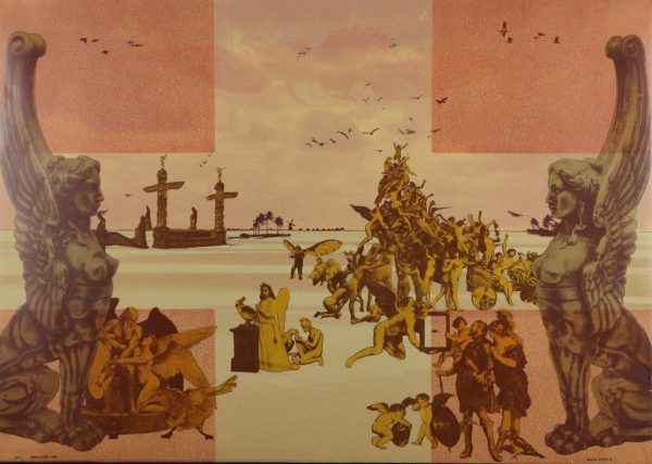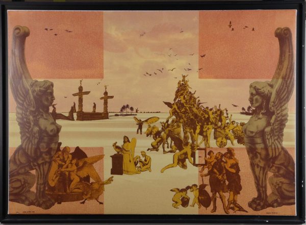 Zeefdruk op papier, op doek geplakt, oplage 2/99. Gesigneerd aan voorzijde, in zwart houten baklijst zonder glas.